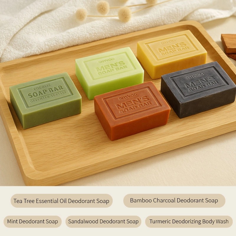 A 5-variant deodorant soap collection for men, featuring distinct fragrances and targeted functions, formulated with plant essence for mild cleansing and effective deodorization.