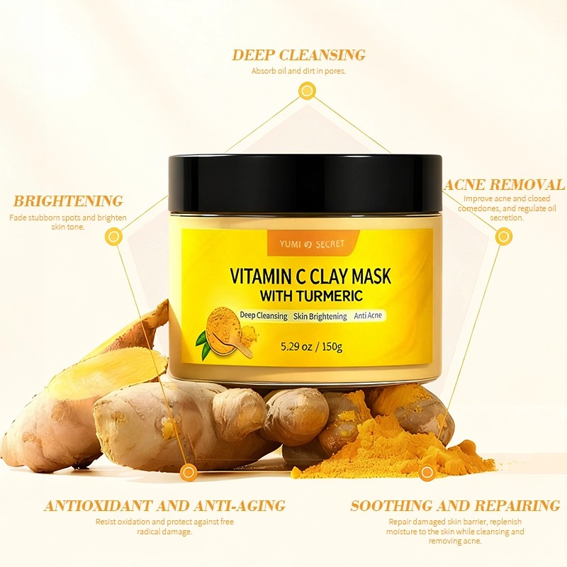 Our turmeric mud mask: kaolin + charcoal remove blackheads, turmeric + niacinamide + vitamin C brighten. Ph.D.-formulated after 3,000+ trials — deep cleansing without stripping. GMPC-made, compliance-ready, fully customizable. OEM/private label, 15-day sampling.