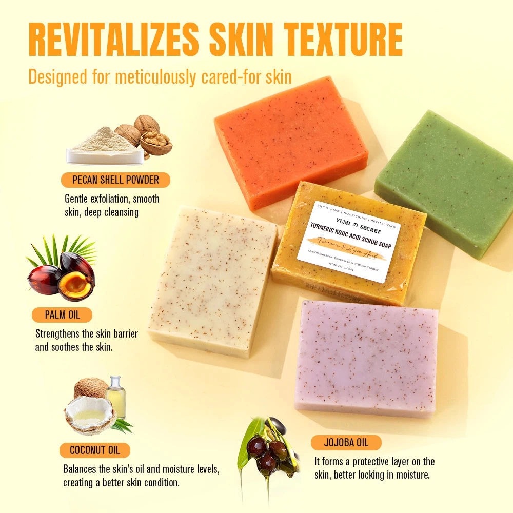 This herbal handmade turmeric soap combines natural vegan ingredients with powerful brightening and anti-acne benefits to effectively reduce dullness while providing gentle daily cleansing for all skin types. Certified with CPNP and HALAL, this solid turmeric soap bar is available for OEM private label services, complete with personalized packaging options for your brand.